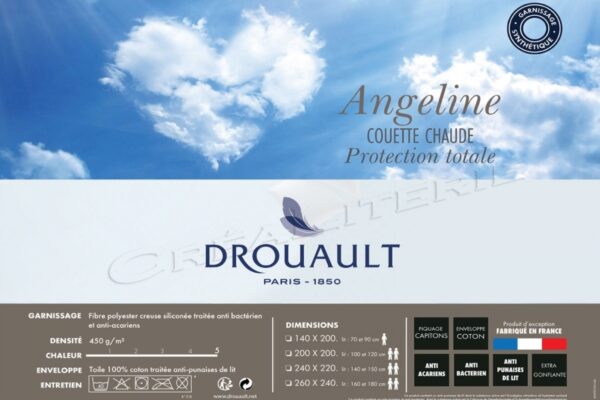 La couette ANGELINE de DROUAULT répond à toutes vos exigences en matière de confort, de durabilité, de douceur, d’hygiène et de bien-être pour un sommeil idéal.