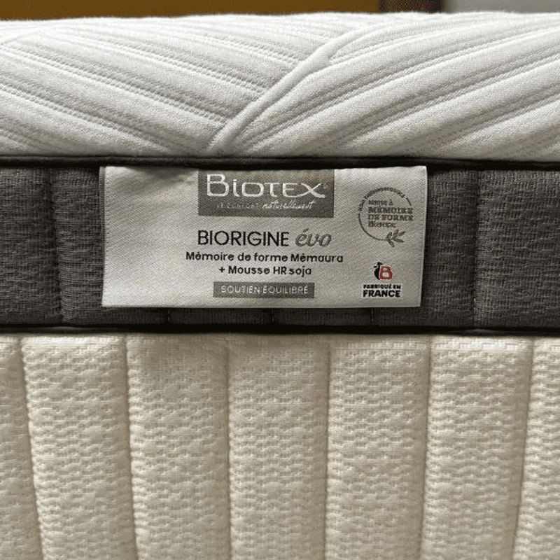 Matelas Biotex Bio Tempo, mousse mémoire de forme Mémaura ultra-aérée + haute résilience soja, fabriqué en France