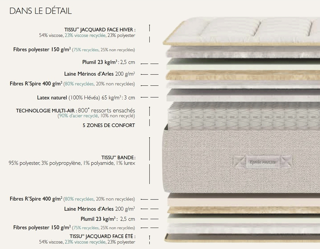 La face hiver du matelas Gaya Épéda possède de la Laine mérinos d’Arles 200g/m², 3 cm latex naturel 65 kg/m3, de la fibres polyester 150 g/m², 2,5 plumil 23 kg/m3 et de la fibres R’Spire 400 g/m².